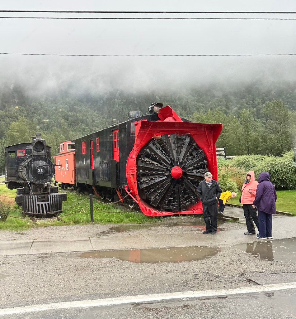 Our driver, Heidi, filled us in on life here… it takes weeks for groceries to arrive by barge from Seattle, and winters bring 5–7 feet of snow (while the surrounding mountains get as much as 40–70 feet). One of their snow blowers is pushed by a train. One of their snow blowers is pushed by a train.